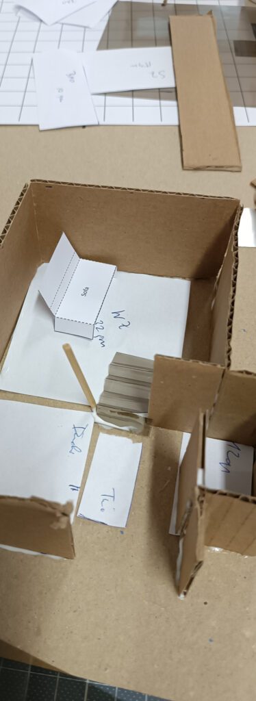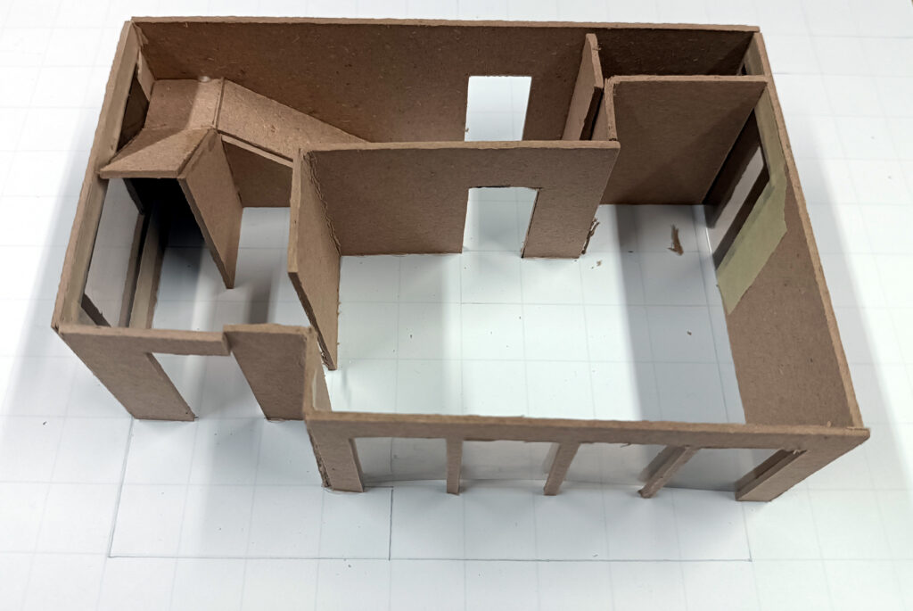 Das eigene Haus für die Weißenhofsiedlung zielt auf die Organisation eines Grundrisses ab. Mit vorgegebenen Raumgrößen soll ein Haus mit Erd- und Obergeschoss organisiert werden. Das Volumen soll möglichst kompakt und klein sein. Mit Papiermöbeln werden die Räume auf ihre Größe überprüft und optisch getestet. Wichtig ist die Platzierung der Treppe und der Nasszellen. Es entsteht ein Arbeitsmodell, mit dem ausprobiert, verbessert und optimiert werden soll. Arbeitsspuren sind nicht wichtig, sondern die Schlüssigkeit des Grundrisses.