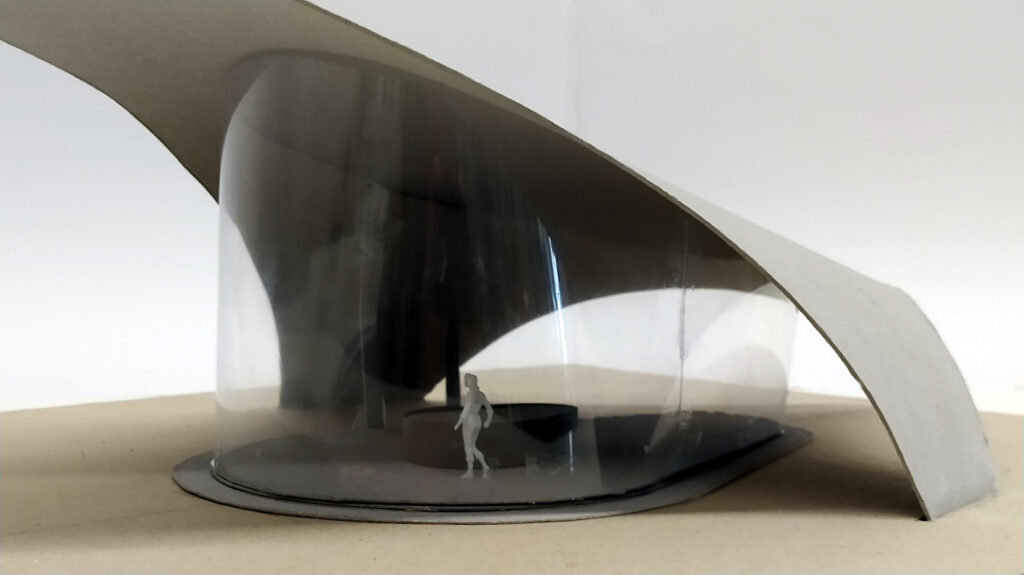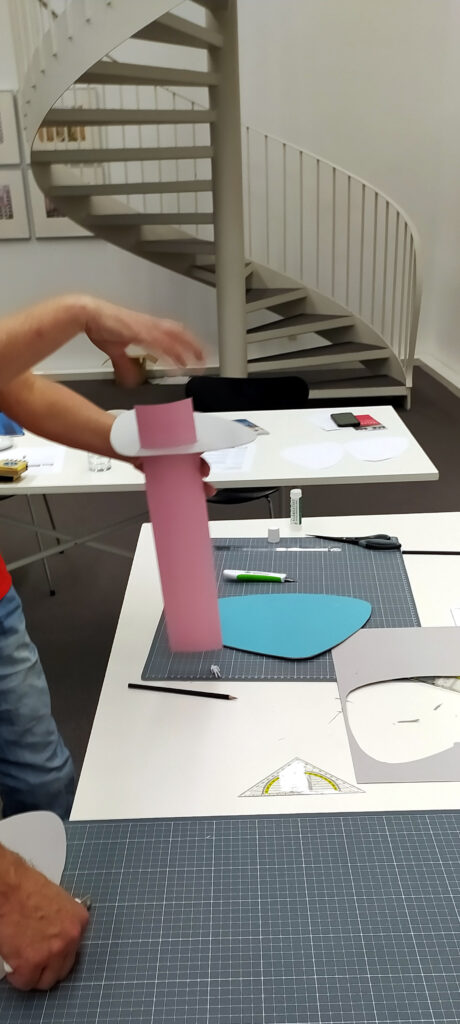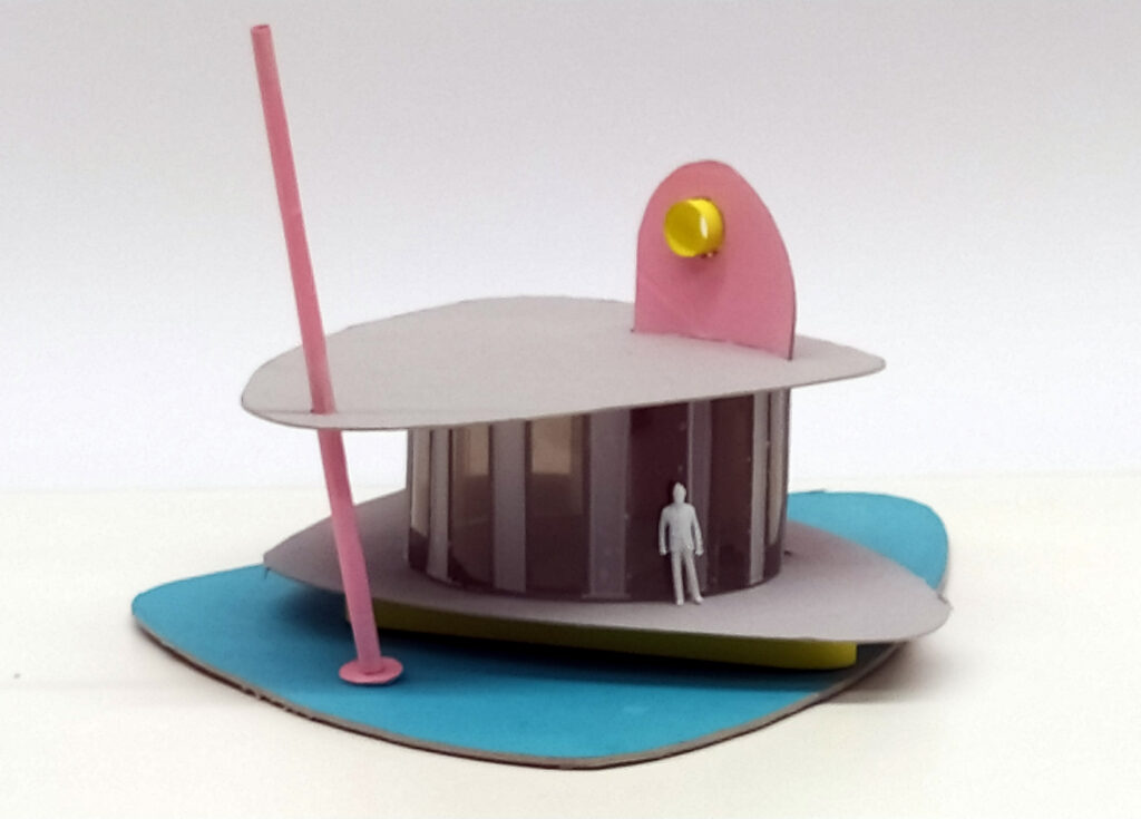 Ein kleiner Pavillon im Stil der Wirtschaftswunderjahre – ein Café, eine Eisdiele, ein Autohaus, ein Blumengeschäft … Rund, oval oder nierenförmig, in den zeittypischen Farben Taubenblau, Altrosa, Zitronengelb oder Mint, leicht, luftig, filigran … wie ein Schmetterling (papillon).